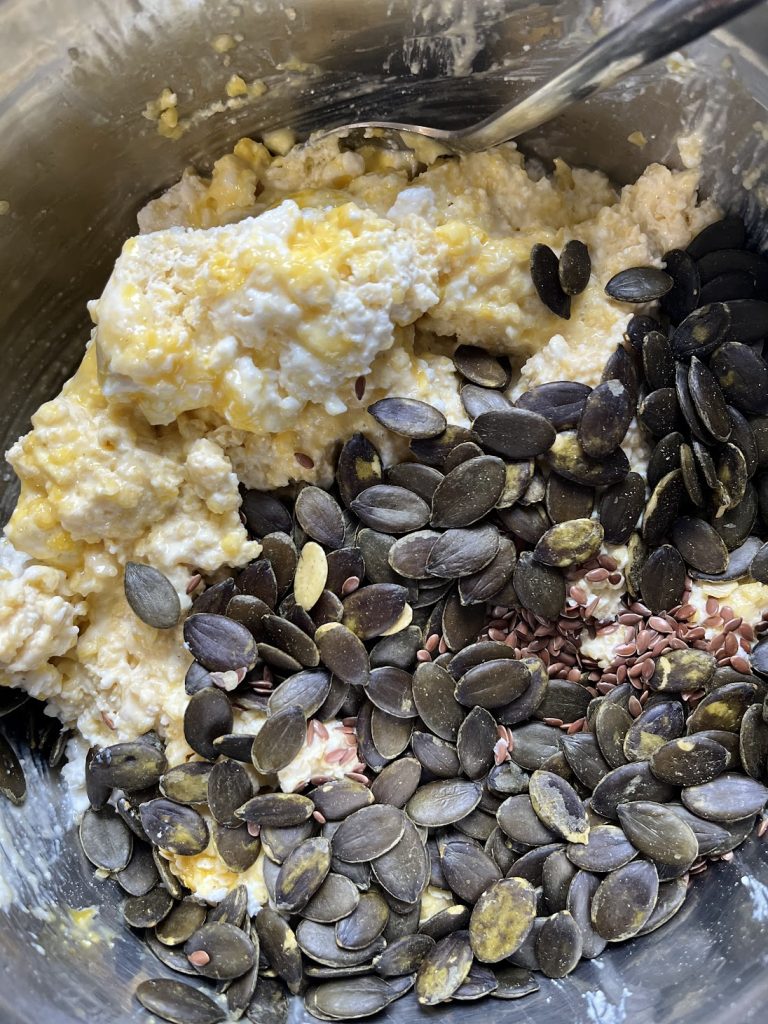 Wrzuć do miski twaróg, jajka, proszek do pieczenia, sól i płatki jaglane. Całość zblenduj niezbyt dokładnie. Następnie dodaj siemię lniane i pestki dyni i wymieszaj wszystko łyżką. Rękoma wyrób ciasto. Następnie uformuj bochenek chleba i wyłóż go na blasze z papierem do pieczenia.